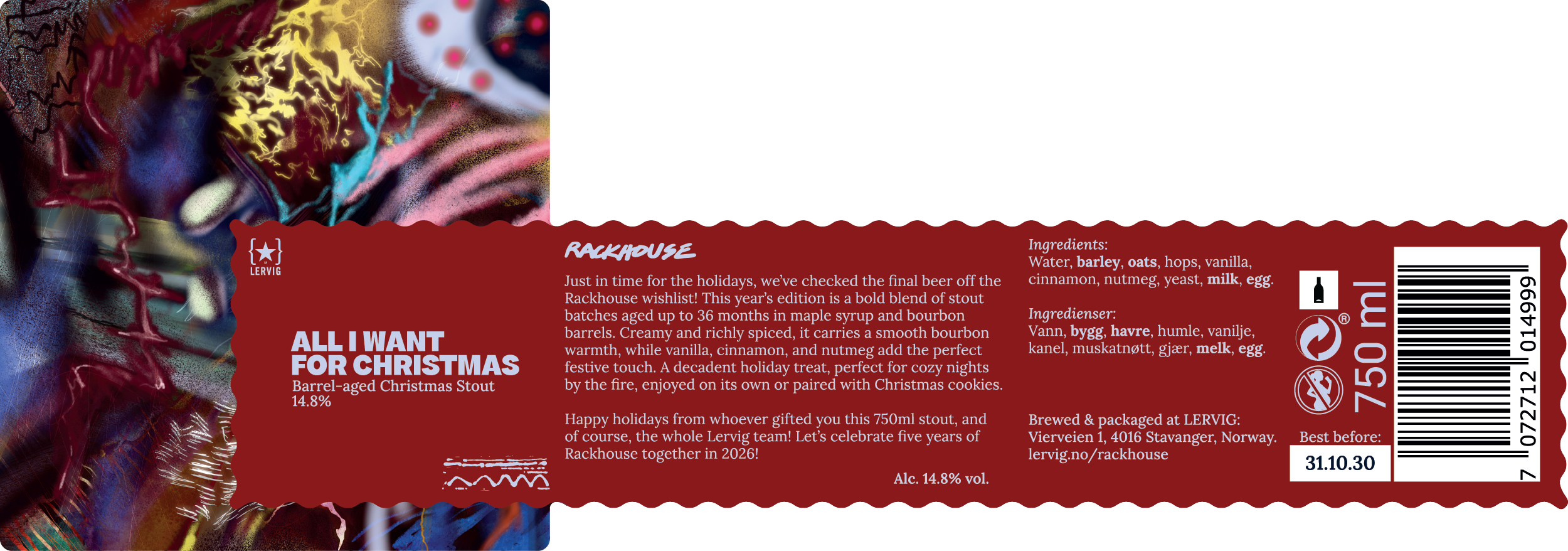 Happy holidays from whoever gifted you this 750ml stout, and of course, the whole Lervig team! Let’s celebrate five years of Rackhouse together in 2026!