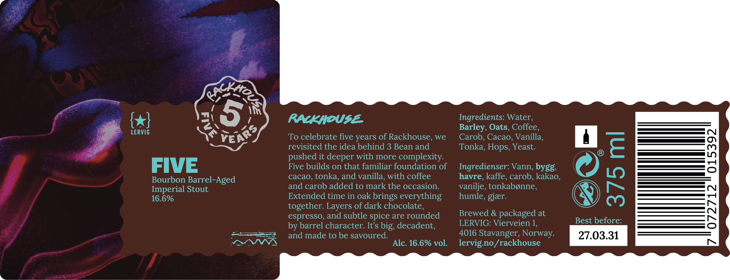 To celebrate five years of Rackhouse, we revisited the idea behind 3 Bean and pushed it deeper with more complexity. Five builds on that familiar foundation of cacao, tonka, and vanilla, with coffee and carob added to mark the occasion. Extended time in oak brings everything together. Layers of dark chocolate, espresso, and subtle spice are rounded by barrel character. It’s big, decadent, and made to be savoured.